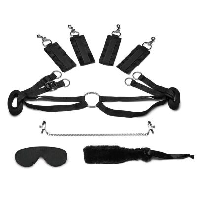 Набор для эротического вечера от американского бренда Lux Fetish: наручники и наножники на липучках c металлической фурнитурой, фиксатор для кровати (подходит к большинству матрасов стандартных размеров), зажимы для сосков, маска на глаза, пушистая шлепалка плюс рюкзак. Набор идеально подходит для начинающих любителей БДСМ. Не подавляйте свои желания, возьмите вашего партнера под полный контроль.